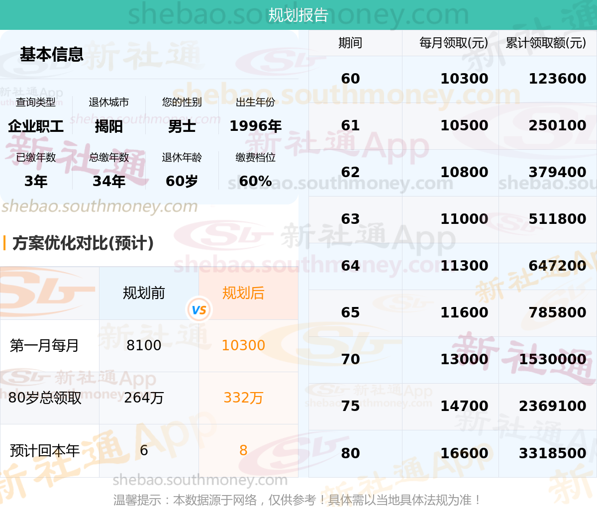 参保城市:揭阳,性别:男士,出生年月:1996,已缴年限:3年,总缴年数:34年,退休年龄:60岁,缴费档位:60%。