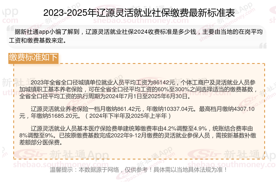 据新社通app数据显示,辽源灵活就业养老保险缴费基数2024-2025年最新标准如下: