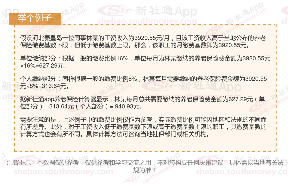 据新社通app养老保险计算器显示,河北秦皇岛职工基本养老保险缴费金额=个人养老保险缴费金额+单位养老保险缴费金额=313.64元+627.29元=940.93元