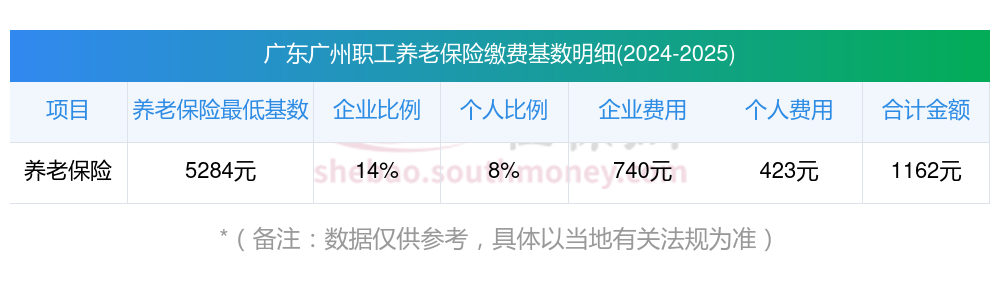 据新社通app获悉,职工养老保险是基本养老保险体系的重要组成部分,它采取的是单位与个人共同缴费的机制。一般而言,个人的缴费比例为8%。在常规情况下,单位所缴纳的养老保险费用会直接汇入养老保险统筹基金账户中,用于整个养老保险体系的资金积累和运作。那么,广东广州养老保险2024-2025年缴费标准是多少?下面随新社通app小编一起来看看详情吧。