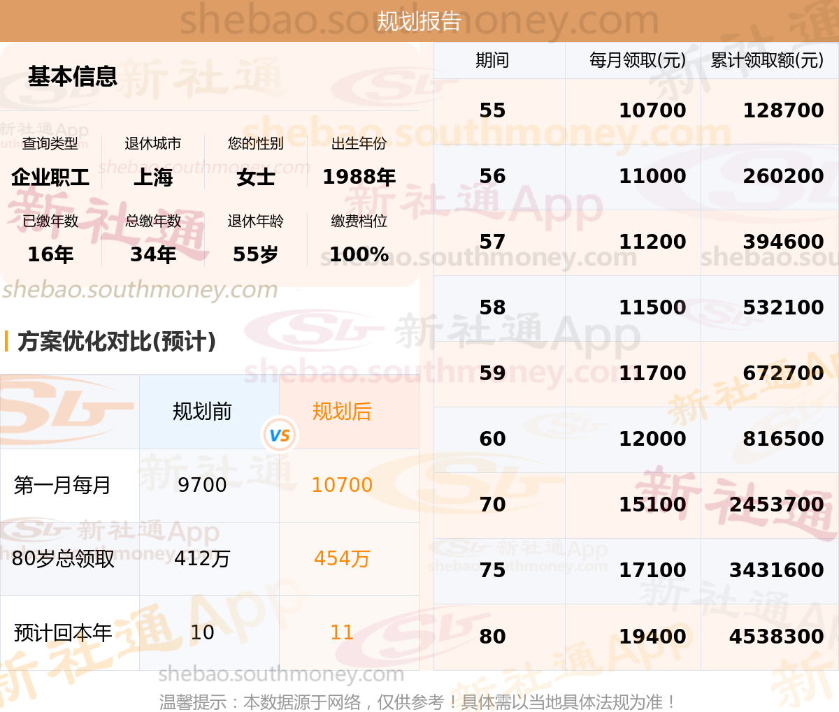 规划前:55岁第一个月约领9700元,新社通APP-养老金规划后:55岁第一个月约领10700元
