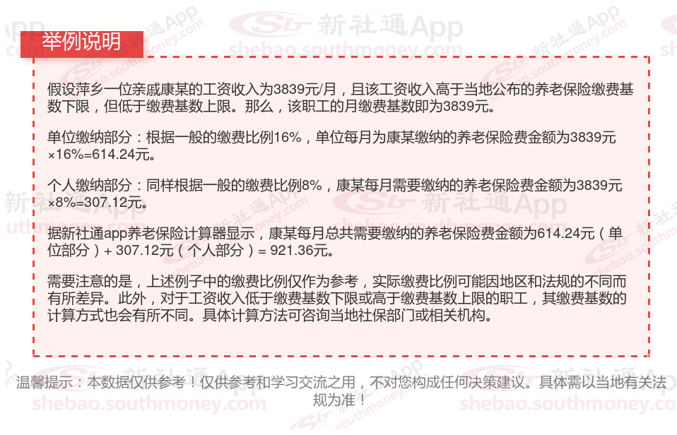 据新社通app显示,萍乡养老保险缴费基数2024-2025年最新标准如下: