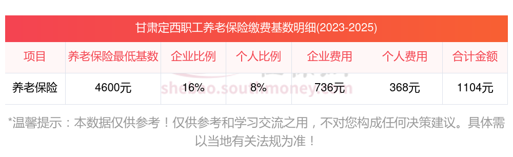 甘肃定西养老保险缴费基数2023年最新标准(最低)