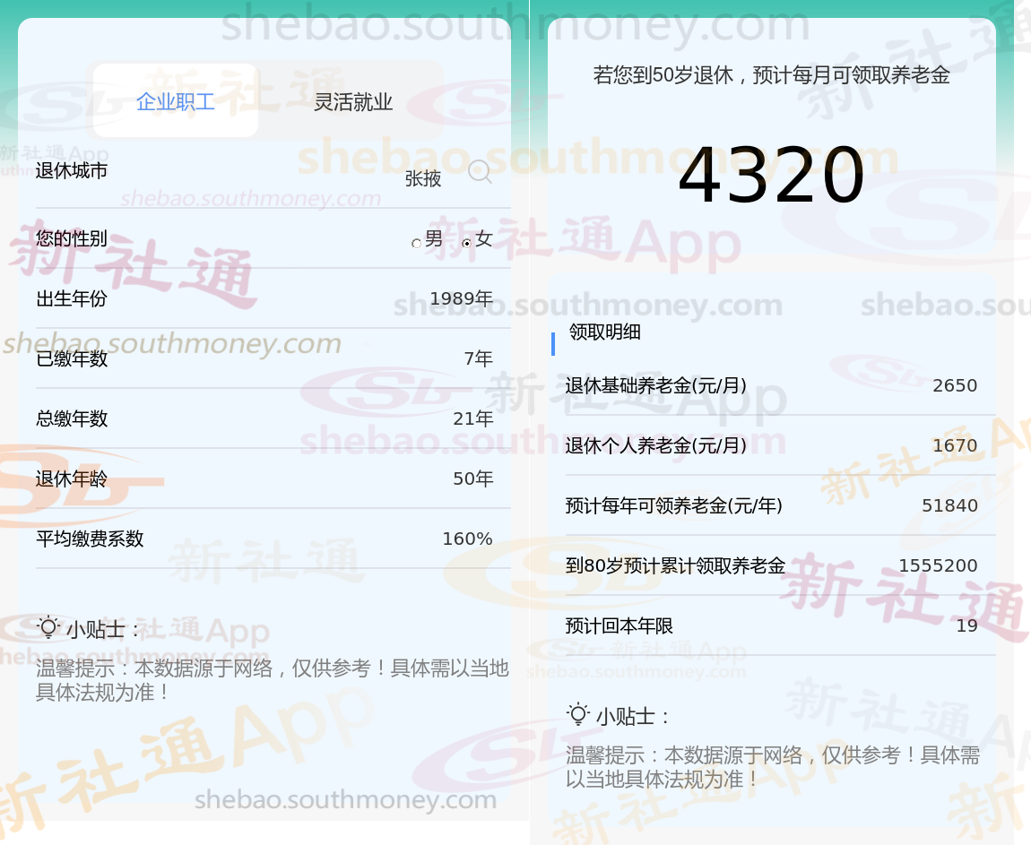 通过新社通APP-养老金计算所得:退休城市、出生年份、退休年龄、缴费系数都相同的情况下,社保缴费年限累计21年时,计算如下: