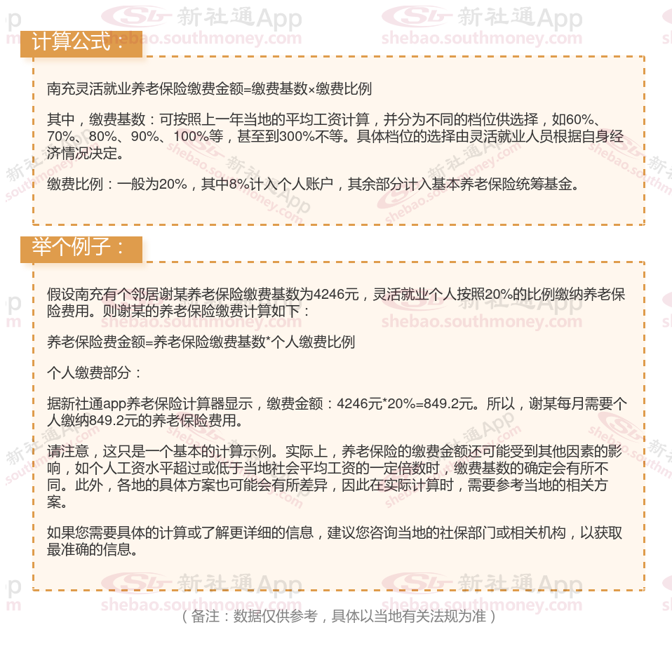 据新社通app小编了解,2024年的灵活就业社保缴费价格表因地区而异,不同城市有不同的缴费标准和方案。下面随新社通小编一起来看看南充2024-2025灵活就业养老保险社保缴费价格表,灵活就业养老保险一个月多少钱的详情吧。