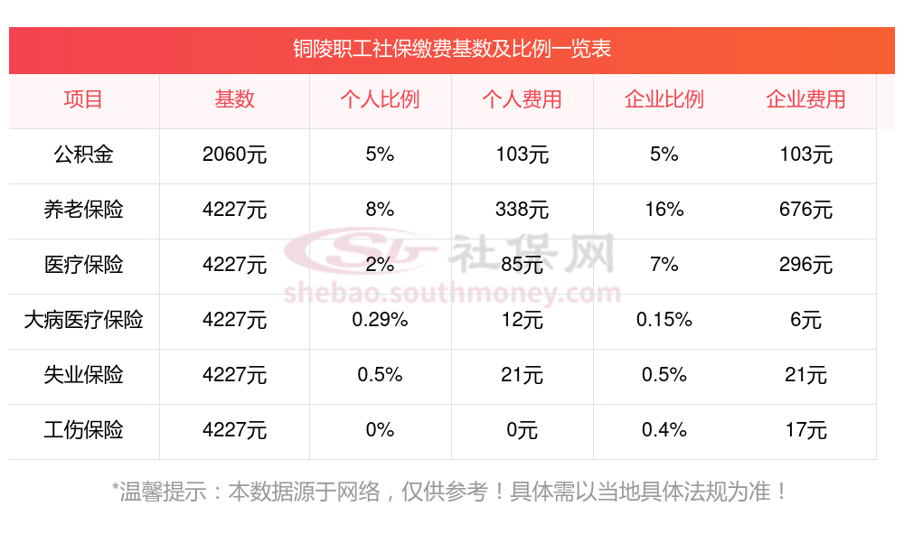 2025年在职人员参保缴费4058元,下表是铜陵社保费用明细参考,根据新社丫丫-社保缴费查询工具提供的最新数据如下: