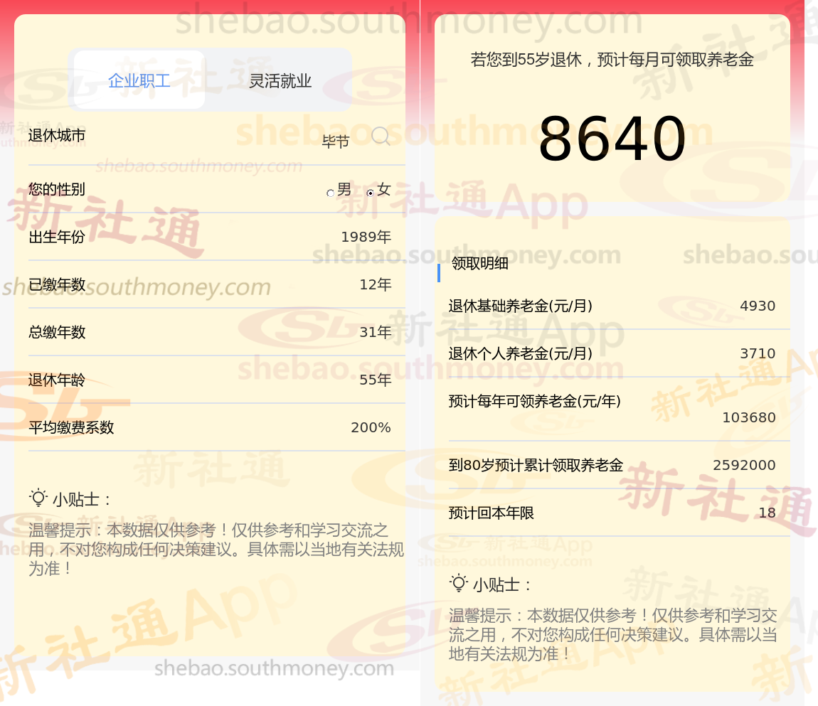 通过新社通APP-养老金计算所得:退休城市、出生年份、退休年龄、缴费系数都相同的情况下,社保缴费年限累计31年时,计算如下: