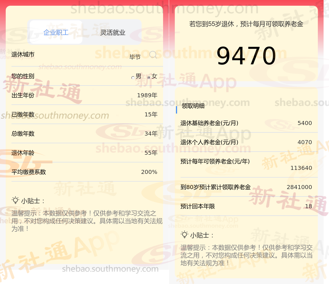 通过新社通APP-养老金计算所得:退休城市、出生年份、退休年龄、缴费系数都相同的情况下,社保缴费年限累计34年时,计算如下:
