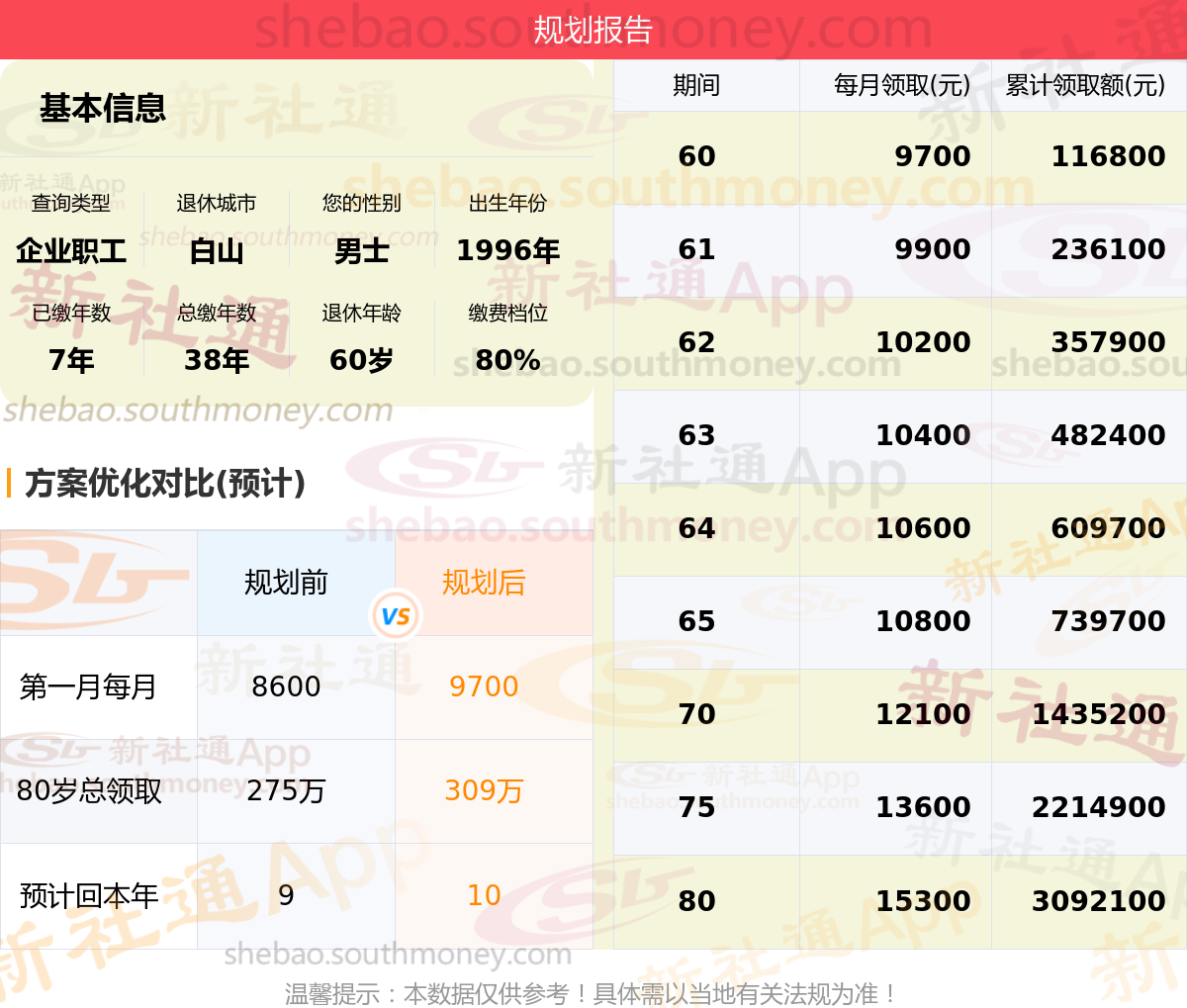 规划前:参保城市:白山,性别:男士,出生年月:1996,已缴年限:7年,总缴年数:38年,退休年龄:60岁,缴费档位:80%。