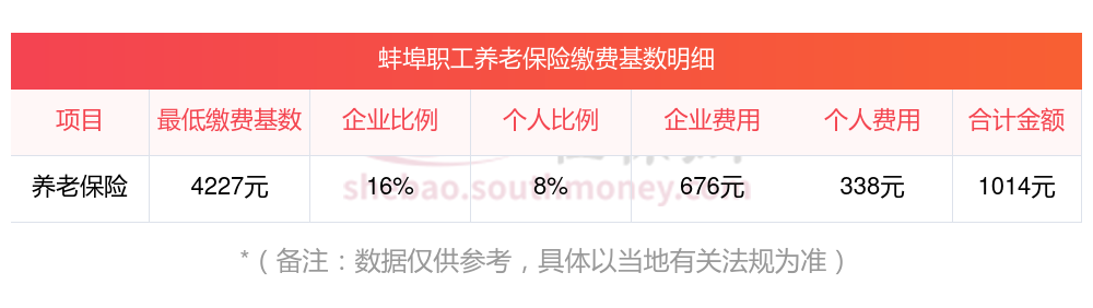 假设蚌埠的养老保险缴费基数为4227元,个人按照8%的比例缴纳养老保险费用,企业按照16%的比例缴纳。则该职工的养老保险缴费计算如下: