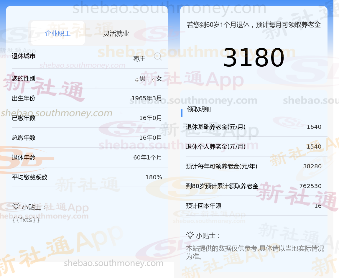 个人基础信息:男性,1965年出生,枣庄退休人士,拥有16年的缴费年限,缴费档次为180%。