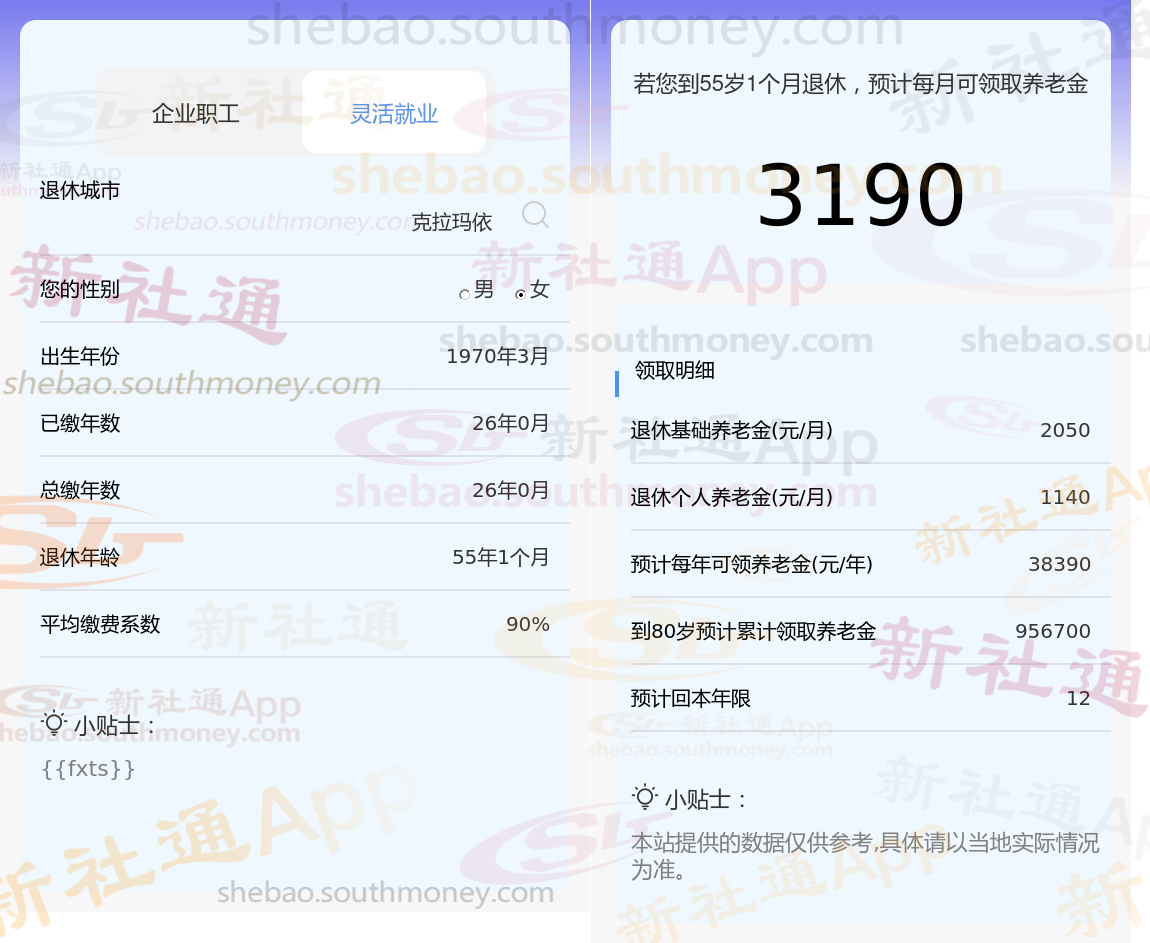 退休城市:克拉玛依,性别:女,出生年份:1970,总缴年数26年,缴费档次:90%,新社通app养老金计算器所得: