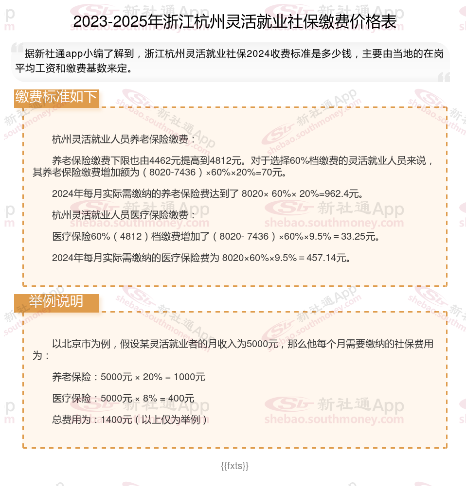 据新社通app数据显示,浙江杭州灵活就业养老保险缴费基数2024-2025年最新标准如下: