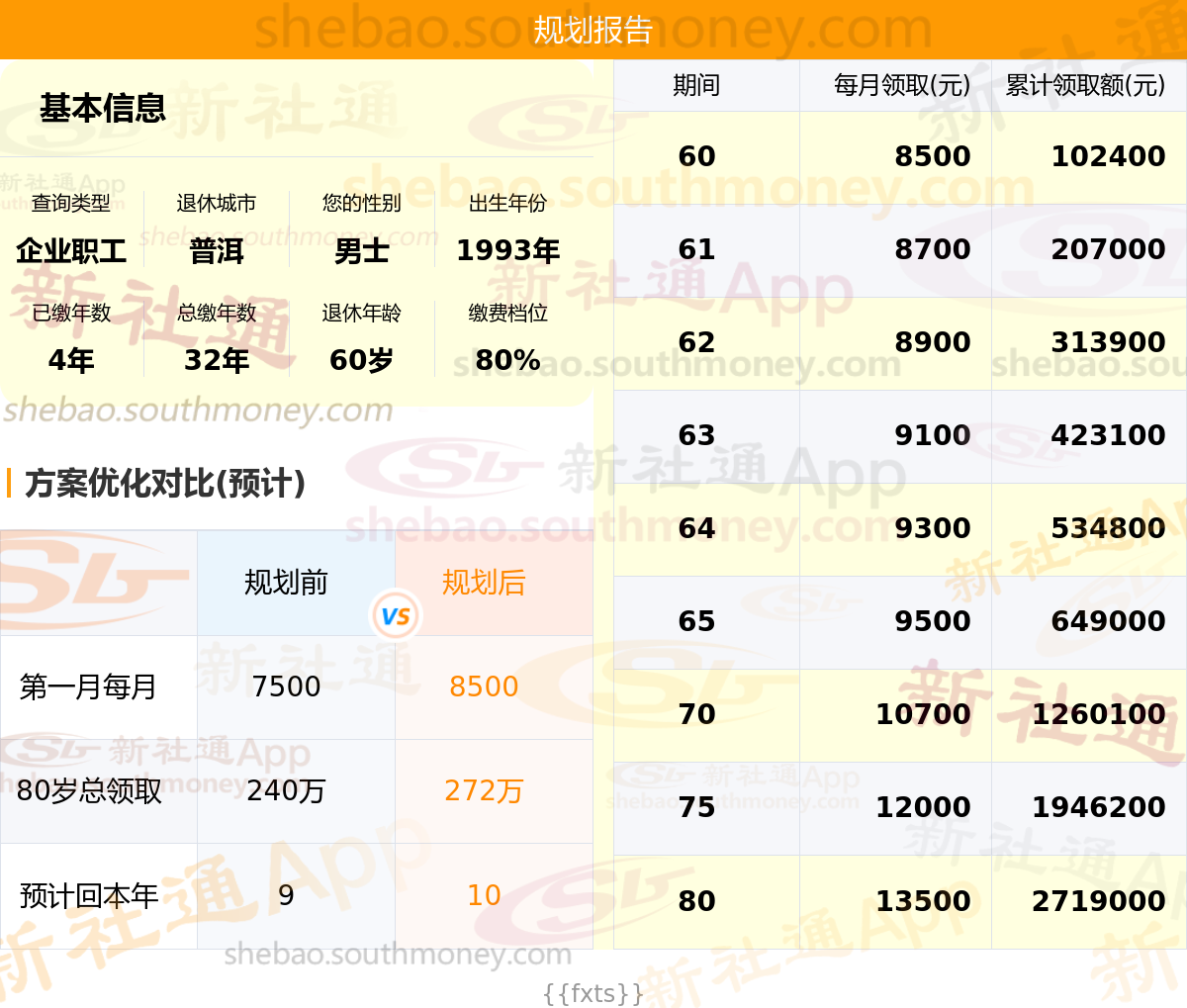 规划前:60岁第一个月约领7500元,新社通APP-养老金规划后:60岁第一个月约领8500元