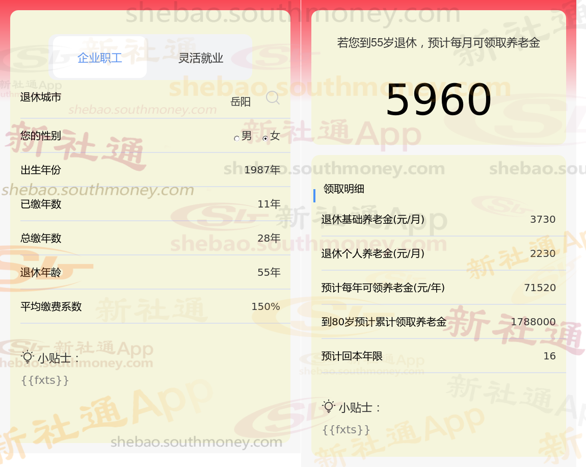 通过新社通APP-养老金计算所得:退休城市、出生年份、退休年龄、缴费系数都相同的情况下,社保缴费年限累计28年时,计算如下: