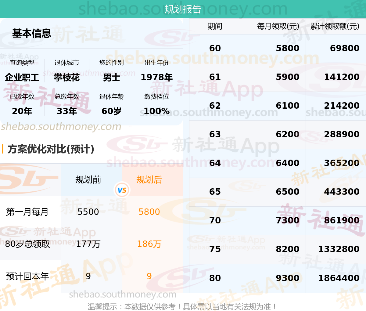规划前:60岁第一个月约领5500元,新社通APP-养老金规划后:60岁第一个月约领5800元