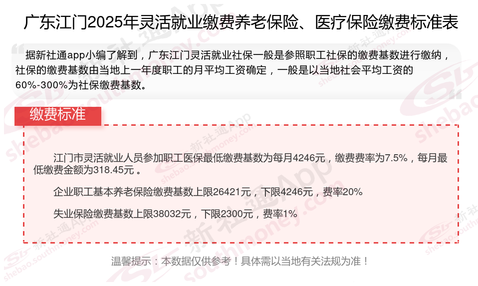 据新社通app数据显示,广东江门灵活就业养老保险缴费基数2024-2025年最新标准如下: