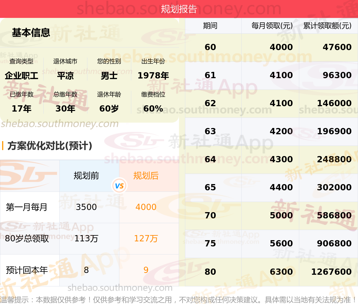 规划前:参保城市:平凉,性别:男士,出生年月:1978,已缴年限:17年,总缴年数:30年,退休年龄:60岁,缴费档位:60%。