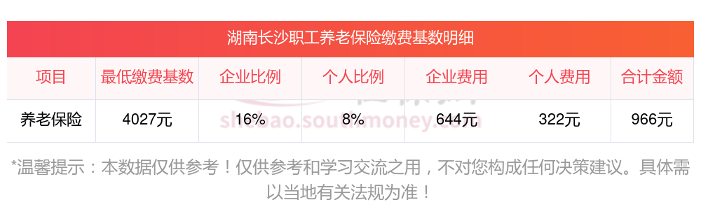 假设湖南长沙的养老保险缴费基数为4027元,个人按照8%的比例缴纳养老保险费用,企业按照16%的比例缴纳。则该职工的养老保险缴费计算如下: