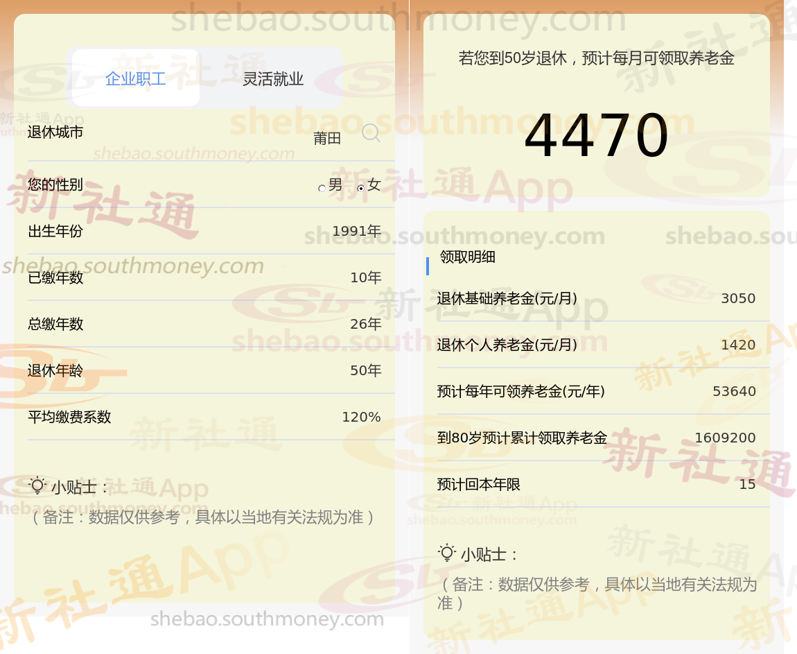 通过新社通APP-养老金计算所得:退休城市、出生年份、退休年龄、缴费系数都相同的情况下,社保缴费年限累计26年时,计算如下: