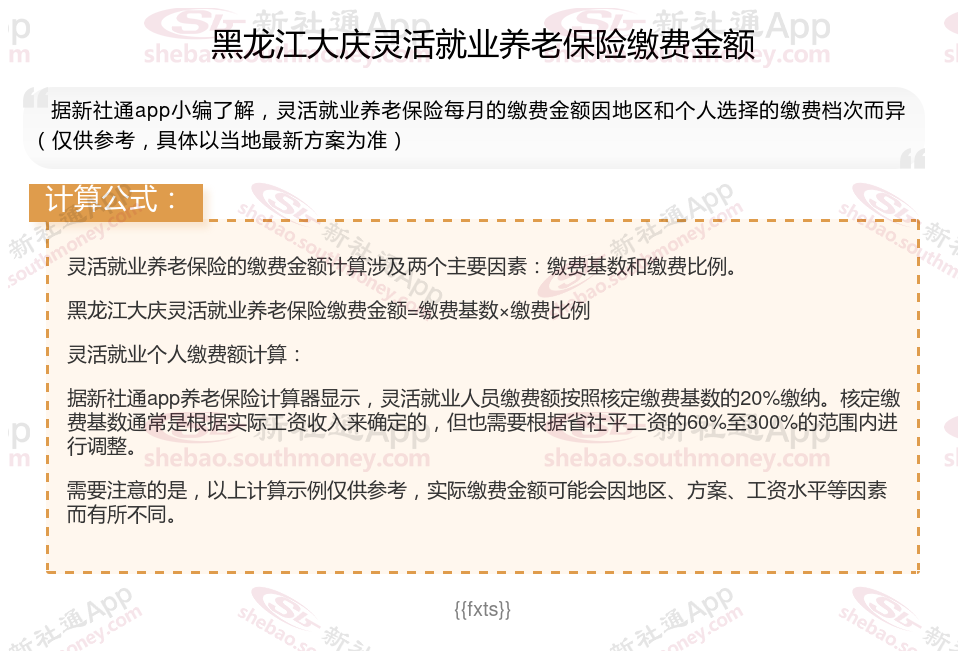 据新社通app显示,2024-2025年黑龙江大庆灵活就业人员养老保险的缴费标准是根据缴费基数来确定的: