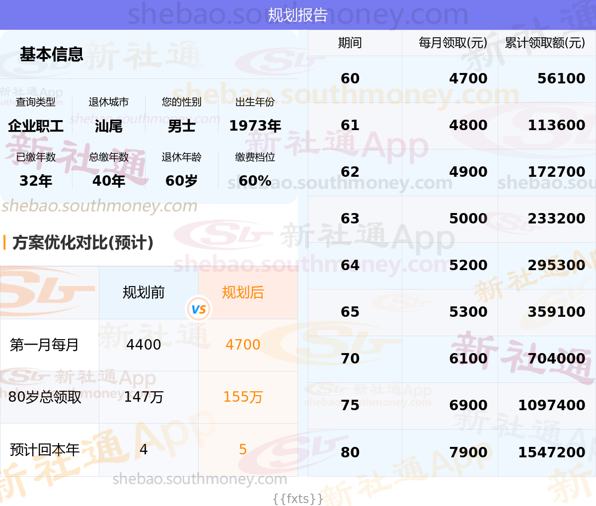 规划前:60岁第一个月约领4400元,新社通APP-养老金规划后:60岁第一个月约领4700元