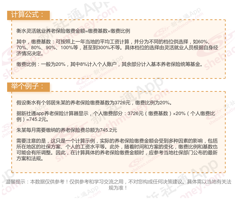 据新社通app显示,衡水灵活就业养老保险最低缴费基数为:3726元;个人的缴费比例分别为:20%;