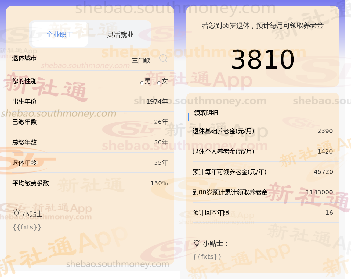 通过新社通APP-养老金计算所得:退休城市、出生年份、退休年龄、缴费系数都相同的情况下,社保缴费年限累计30年时,计算如下: