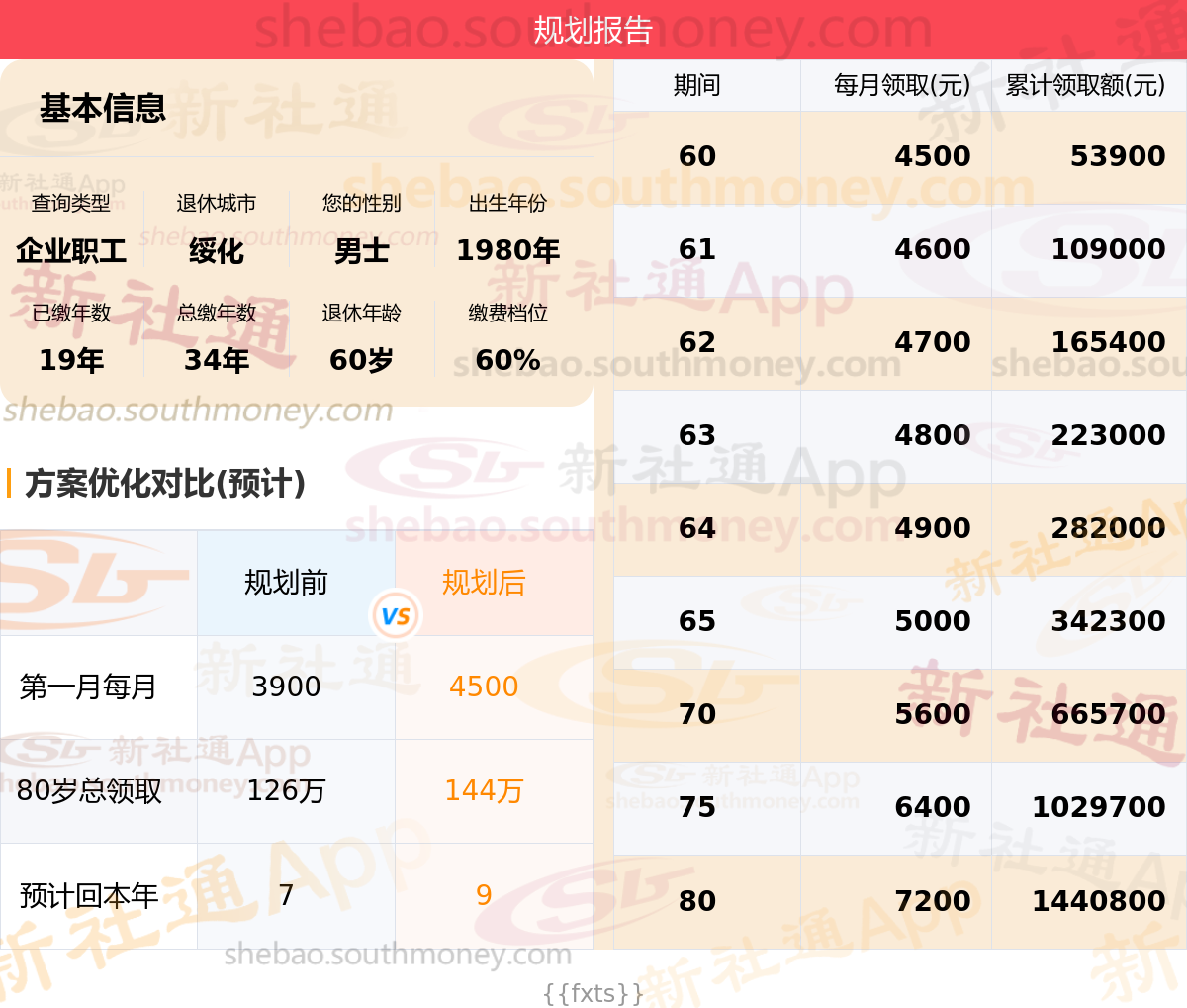 规划前:60岁第一个月约领3900元,新社通APP-养老金规划后:60岁第一个月约领4500元