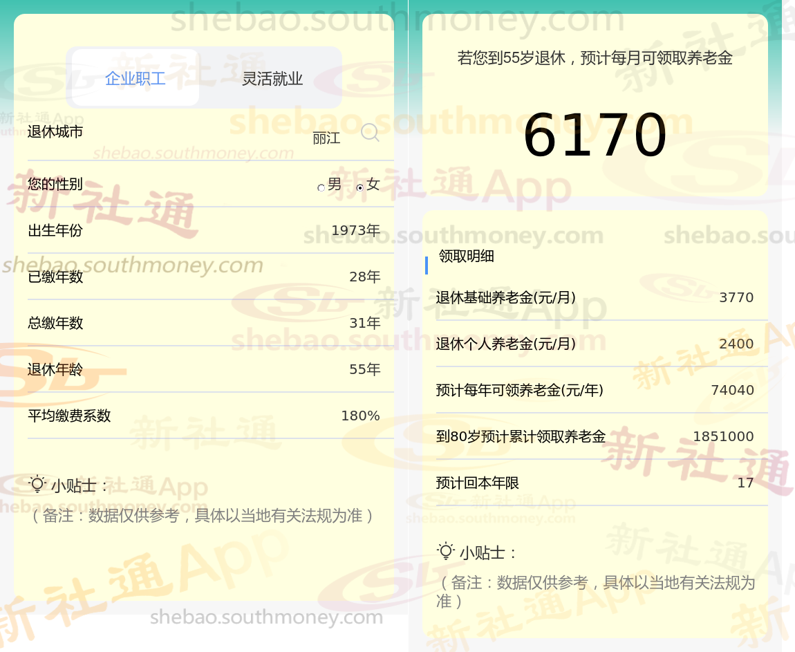 通过新社通APP-养老金计算所得:退休城市、出生年份、退休年龄、缴费系数都相同的情况下,社保缴费年限累计31年时,计算如下: