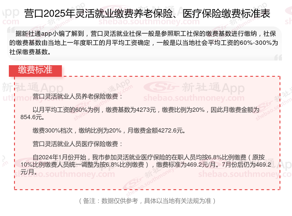 据新社通app数据显示,2024-2025年营口灵活就业人员养老保险的缴费标准: