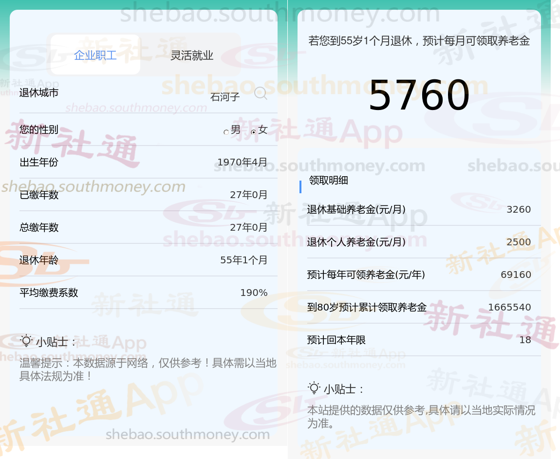王某,石河子人,1970年出生,是一名拥有27载社保缴费年限的退休女性,缴费档次稳定在190%。岁月流转,她终于迎来了自己的退休时光。借助新社通app养老金在线计算器计算所得: