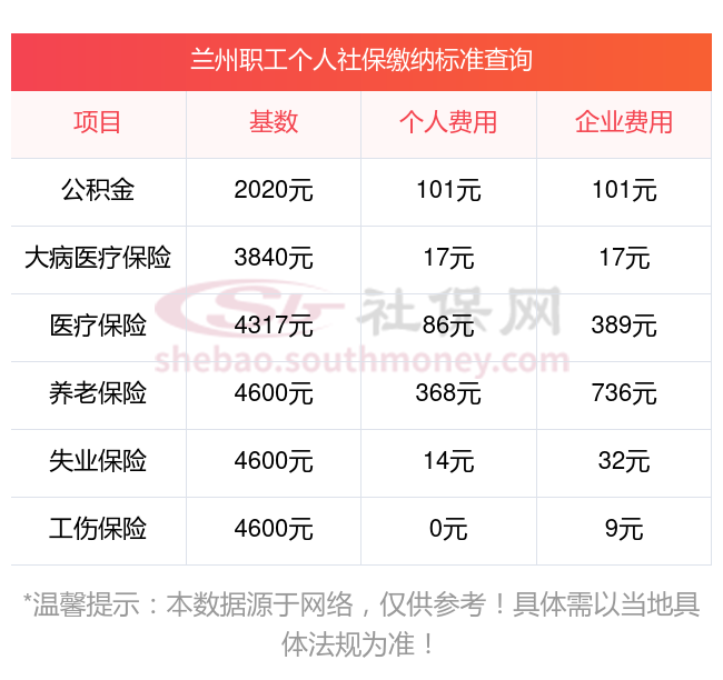 兰州五险最少要交多少钱一个月多少钱?下表是2024-2025年兰州社保费用明细参考,新社通app-社保缴费查询工具提供的最新数据如下: