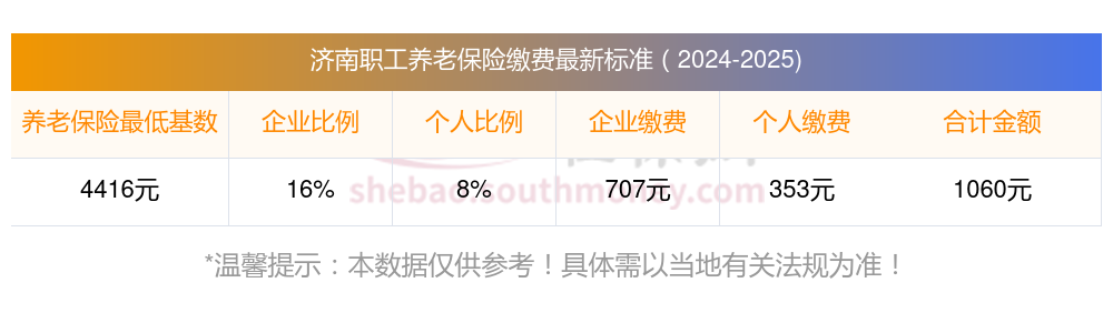假设济南的养老保险缴费基数为4416元,个人按照8%的比例缴纳养老保险费用,企业按照16%的比例缴纳。则该职工的养老保险缴费计算如下:
