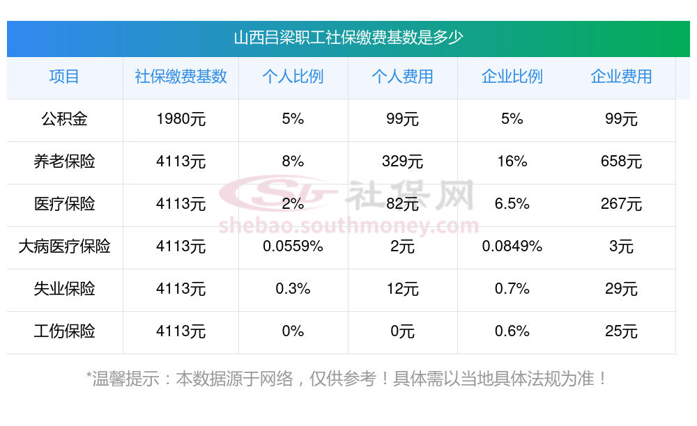 山西吕梁社保一个月交多少钱,个人缴纳多少钱一个月?下面和新社通一起来看看山西吕梁最低标准社保费用明细参考,新社通app-社保缴费查询工具提供的最新数据如下: