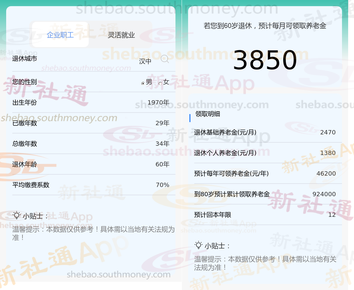 通过新社通APP-养老金计算所得:退休城市、出生年份、退休年龄、缴费系数都相同的情况下,社保缴费年限累计34年时,计算如下: