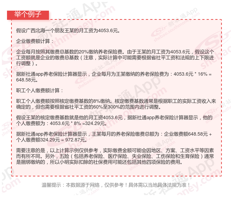 据新社通app显示,广西北海企业职工养老保险的缴费基数为:4053.6元。
