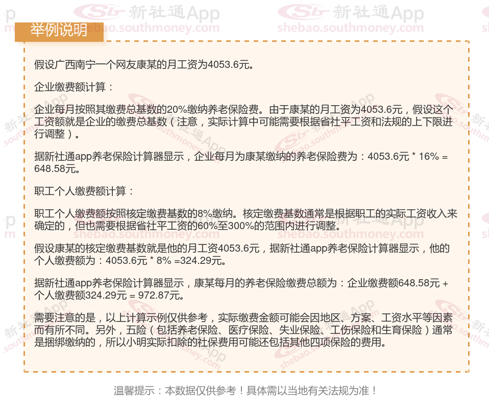 据新社通app显示,广西南宁企业职工养老保险的缴费基数为:4053.6元。