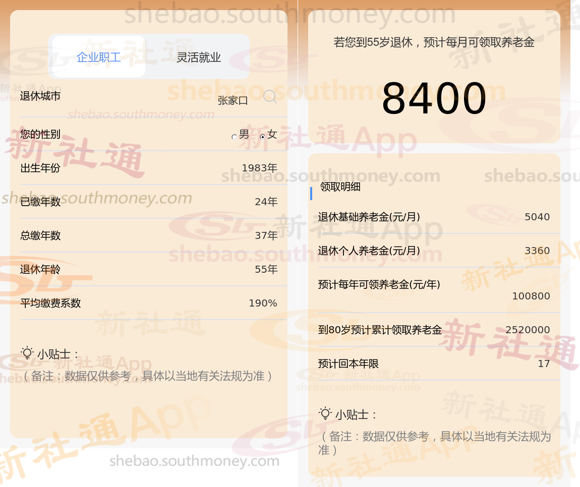 通过新社通APP-养老金计算所得:退休城市、出生年份、退休年龄、缴费系数都相同的情况下,社保缴费年限累计37年时,计算如下: