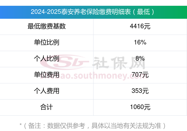 据新社通app显示,泰安职工养老保险最低缴费基数为:4416元;单位和个人的缴费比例分别为:16%、8%;