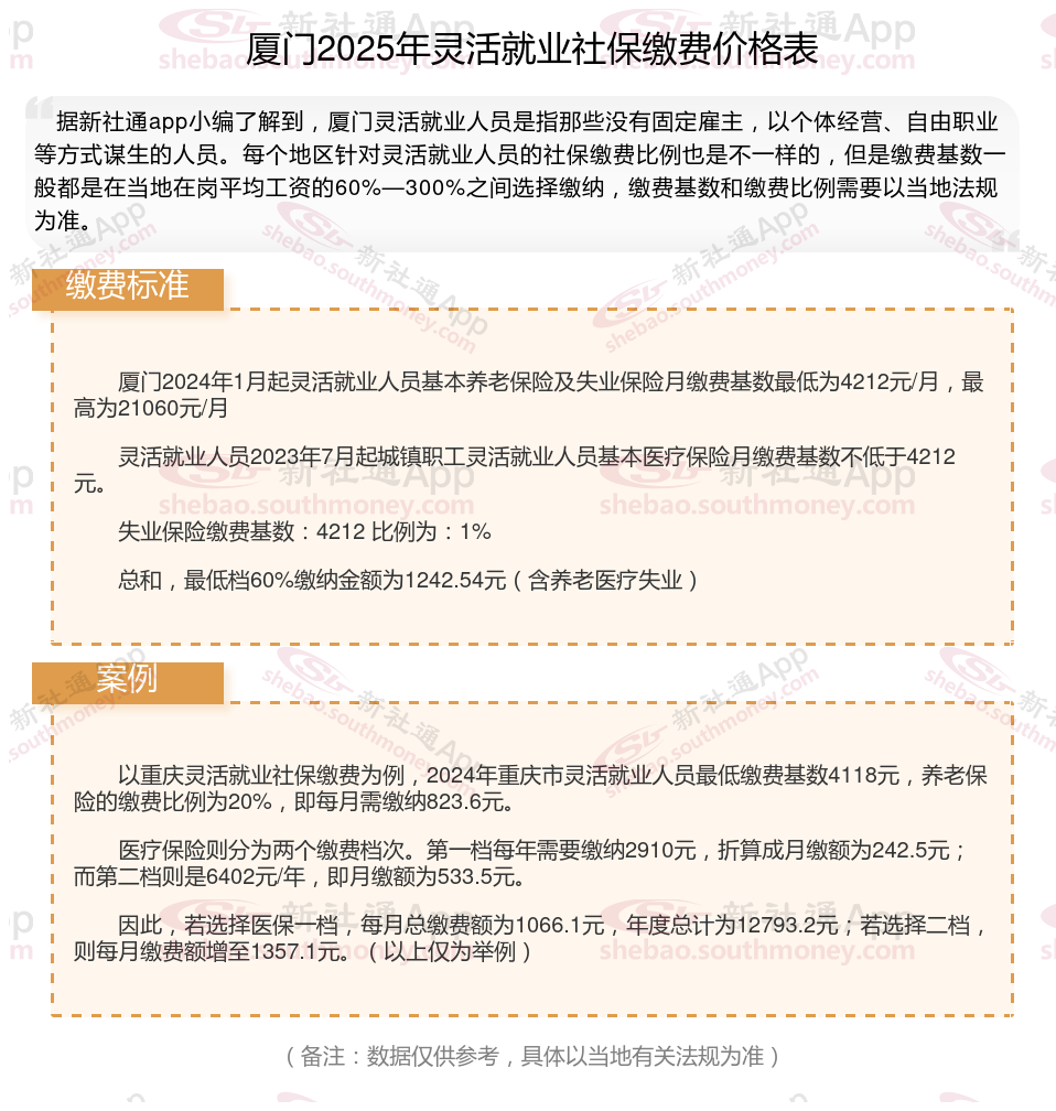 据新社通app数据显示,厦门灵活就业养老保险缴费基数2024-2025年最新标准如下: