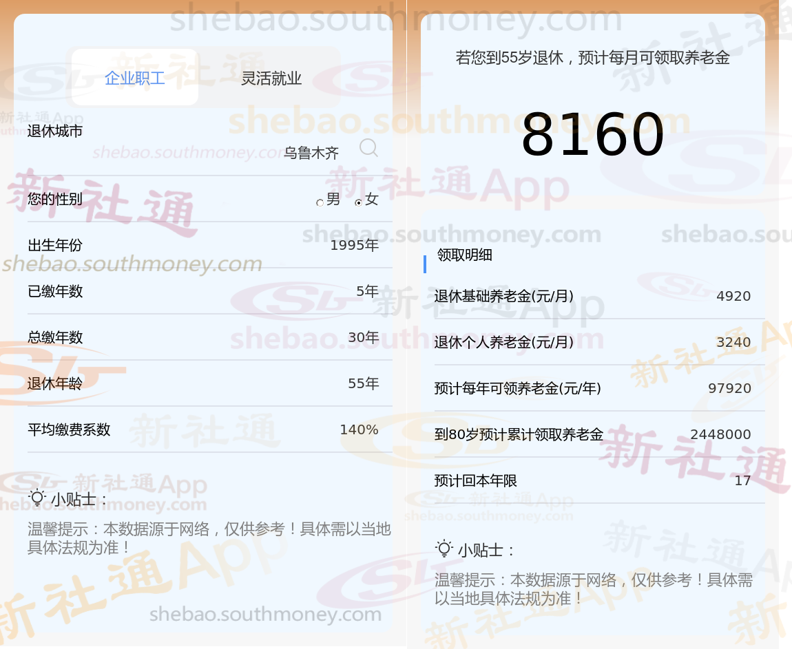 通过新社通APP-养老金计算所得:退休城市、出生年份、退休年龄、缴费系数都相同的情况下,社保缴费年限累计30年时,计算如下: