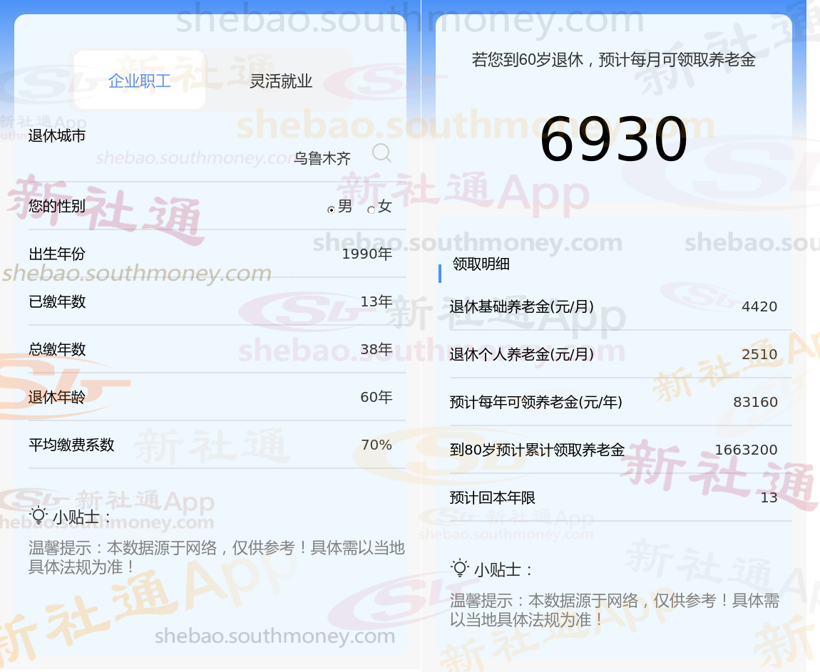 通过新社通APP-养老金计算所得:退休城市、出生年份、退休年龄、缴费系数都相同的情况下,社保缴费年限累计38年时,计算如下: