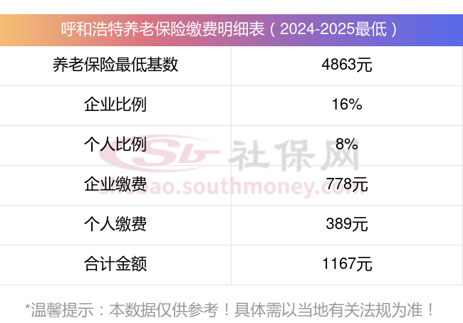 呼和浩特养老保险缴费基数2023-2024年最新标准(最低)
