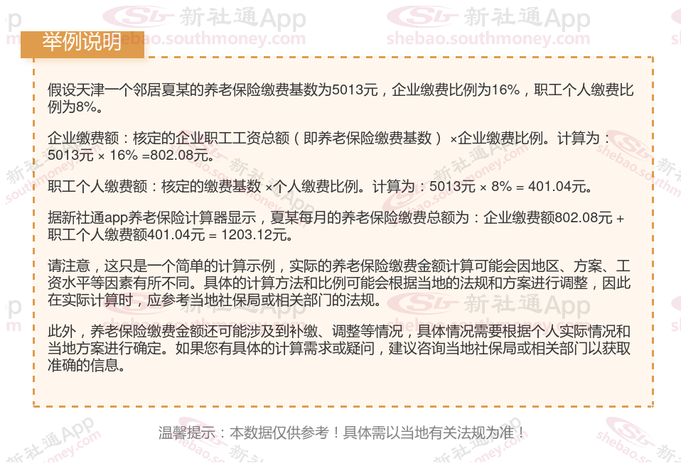 据新社通app获悉,天津养老保险的缴费金额计算通常涉及缴费基数和缴费比例两个因素。以下是一个基于虚构数据的计算举例说明:
