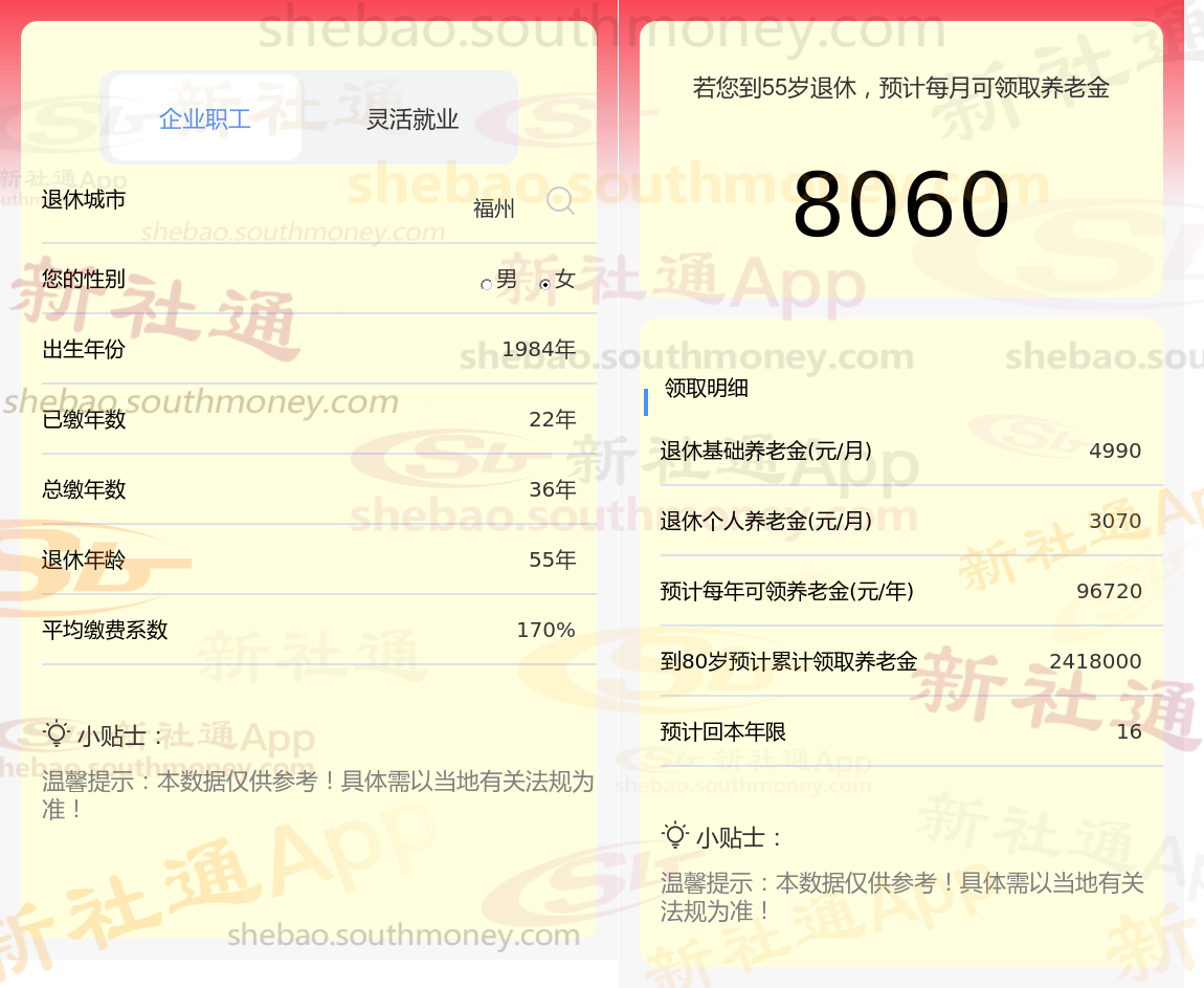 通过新社通APP-养老金计算所得:退休城市、出生年份、退休年龄、缴费系数都相同的情况下,社保缴费年限累计36年时,计算如下:
