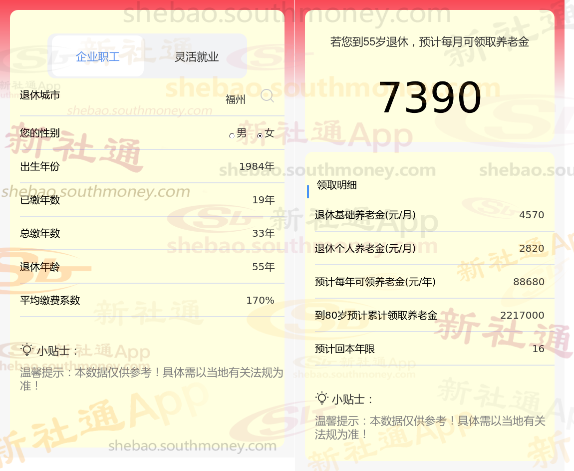 通过新社通APP-养老金计算所得:退休城市、出生年份、退休年龄、缴费系数都相同的情况下,社保缴费年限累计33年时,计算如下: