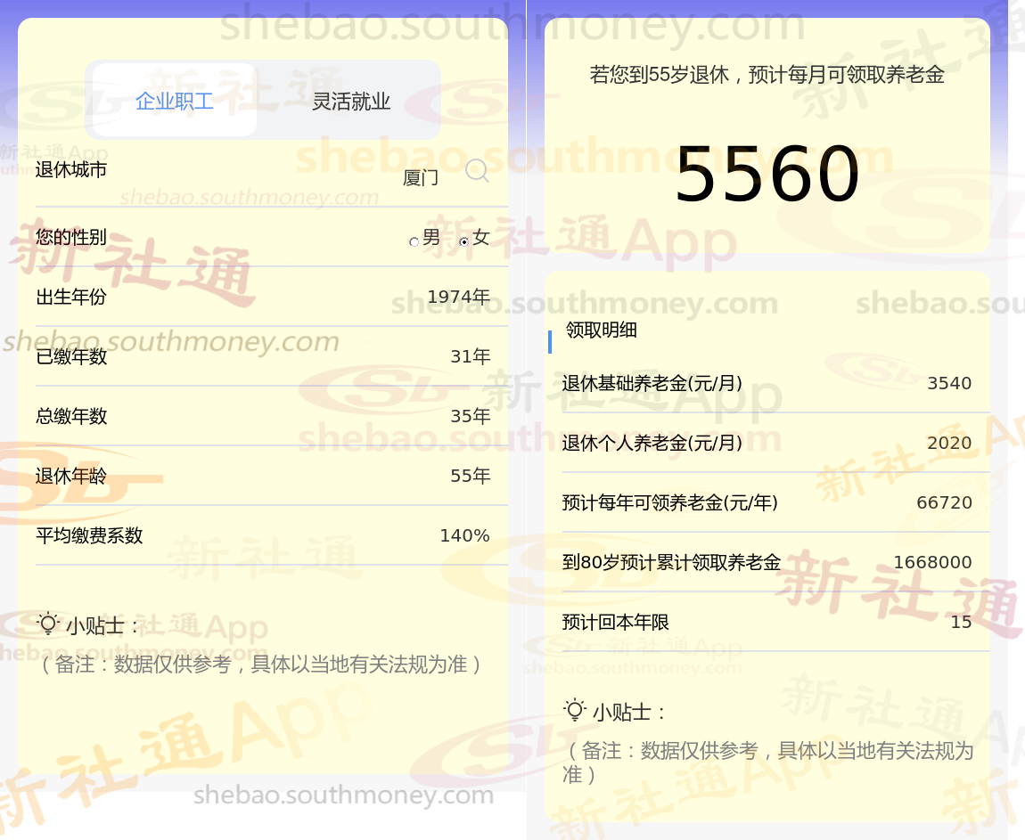 通过新社通APP-养老金计算所得:退休城市、出生年份、退休年龄、缴费系数都相同的情况下,社保缴费年限累计35年时,计算如下: