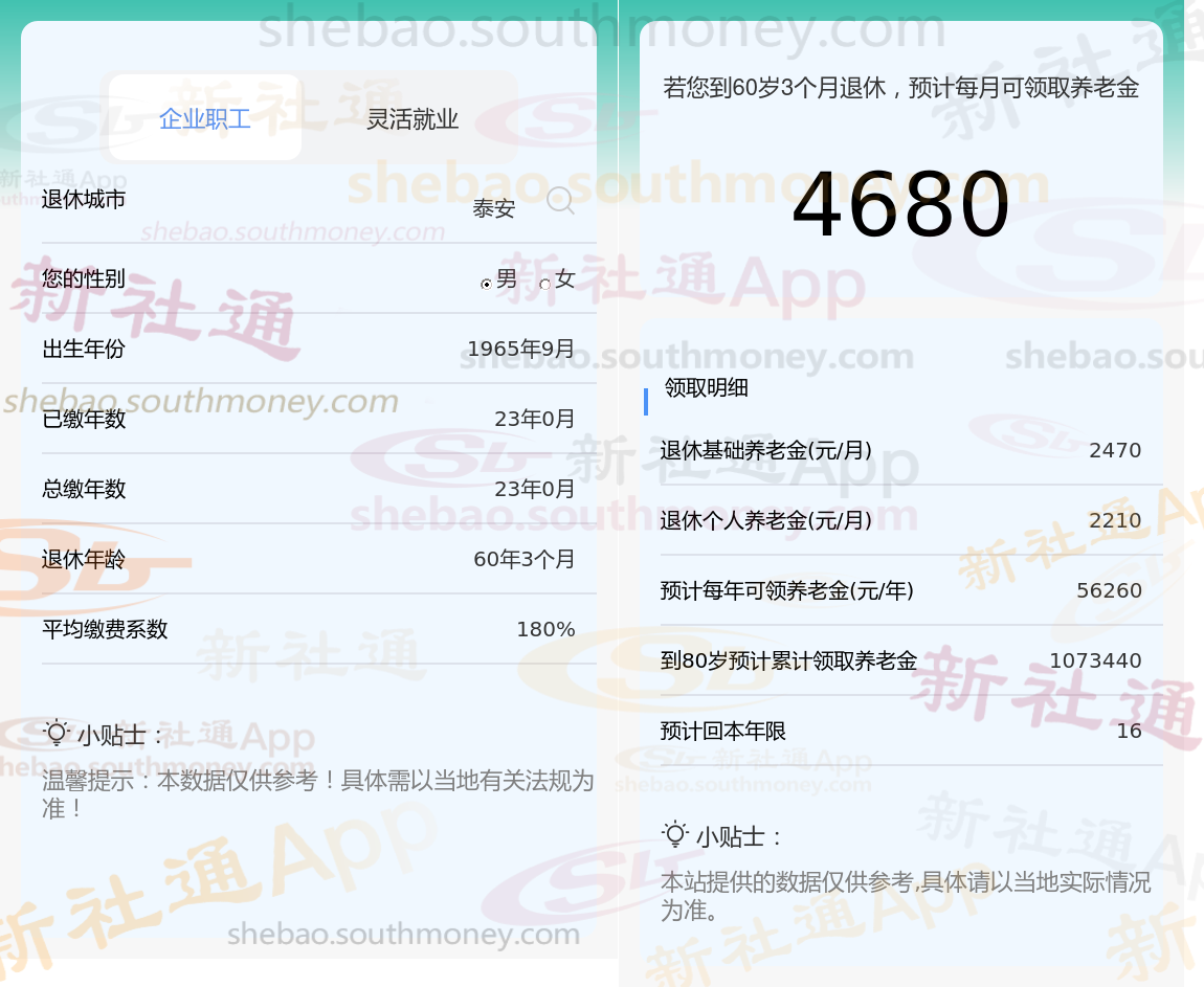 退休城市:泰安,性别:男,出生年份:1965,总缴年数23年,缴费档次:180%,新社通app养老金计算器所得: