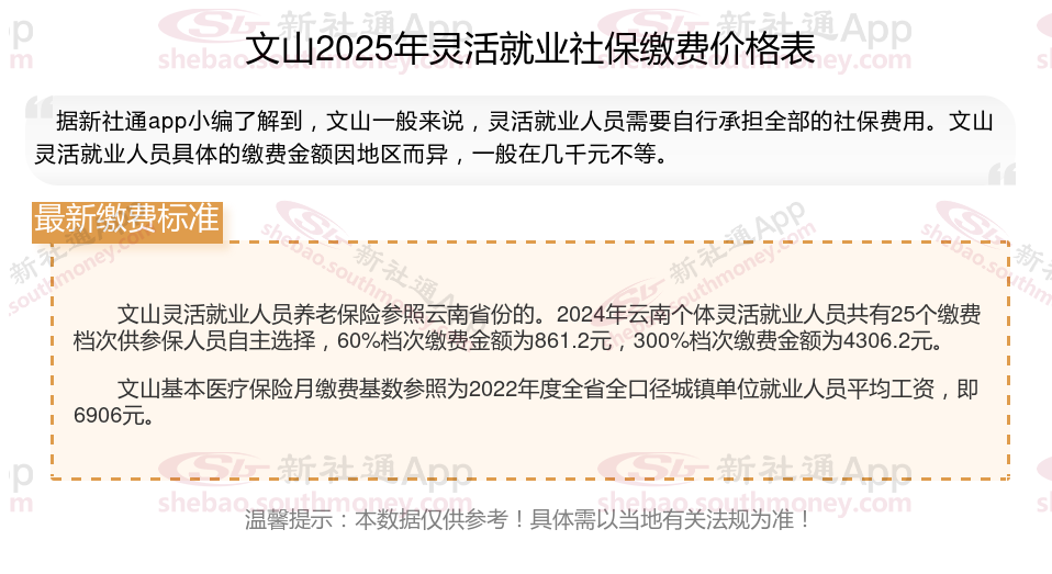 那么,文山灵活就业者社保一个月多少钱?根据新社通app-社保缴费查询工具提供的2025社保缴费标准详情数据: